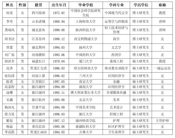 通过公开发布招聘计划、遴选简历、面试、政审、人才工作领导小组会议、校长办公会议等程序,经体检合格后确定下列人员为我单位拟聘用人员,并公示如下: