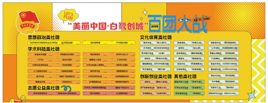 为充分展现学校学生社团特色,推进学生社团规范发展,构建和谐丰富的校园生活,校团委组织开展“美丽中国·白鹭创城”百团大战活动。